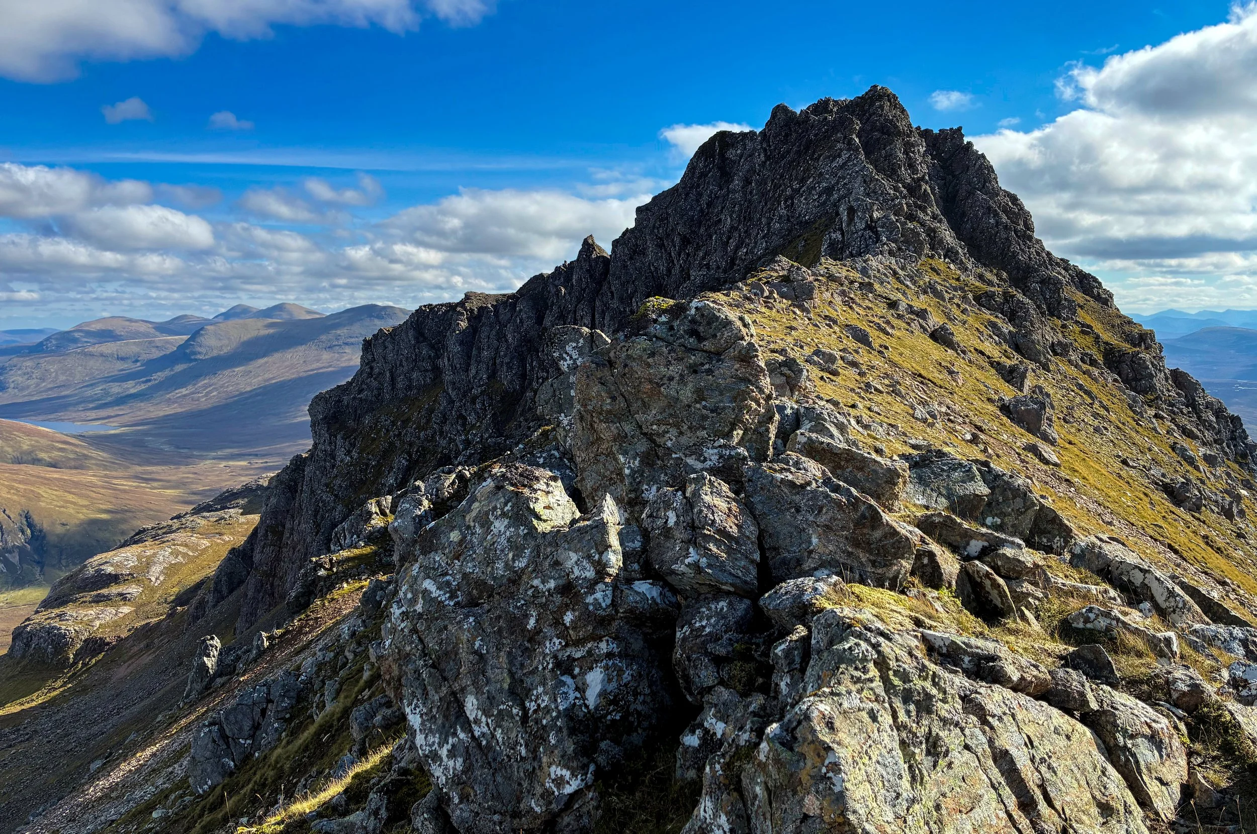 The Fisherfield 6 - the round of five Munros and one Corbett, is something akin to a rite of passage among hill goers. It’s a big day out and traditionally the distance is reduced by spending a night or two at Shenavall after approaching from Dundonnell. The alternative, and a good one if intent solely on Mullach Coire Mhic Fearchair and Beinn Tarsuinn, is to ride in from Kinlochewe. I didn’t have the bike, but decided a few miles running on the flat wouldn’t do me any harm. I also decided at the last minute to take the summits in an anticlockwise direction, and approach Mullach Coire Mhic Fearchair via Sgurr Dubh, which would be a new top for me. It proved to be the best of the day with a short section of airy scrambling reminiscent of the Aonach Eagach and a lovely ridge between the summits.